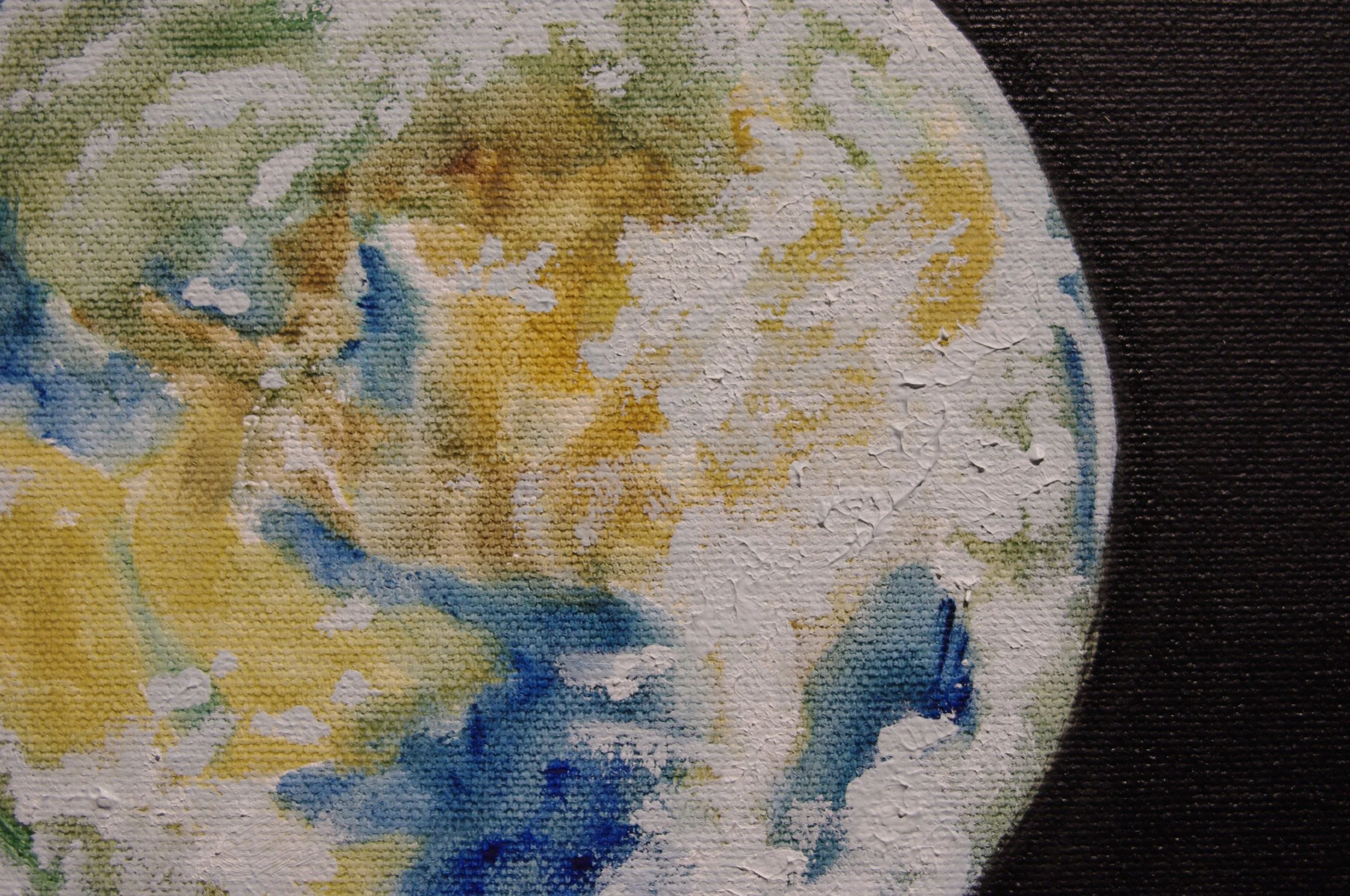 The oil on canvas painting depicts the earth, humbly facing the vast and endless universe, observed by the iris.